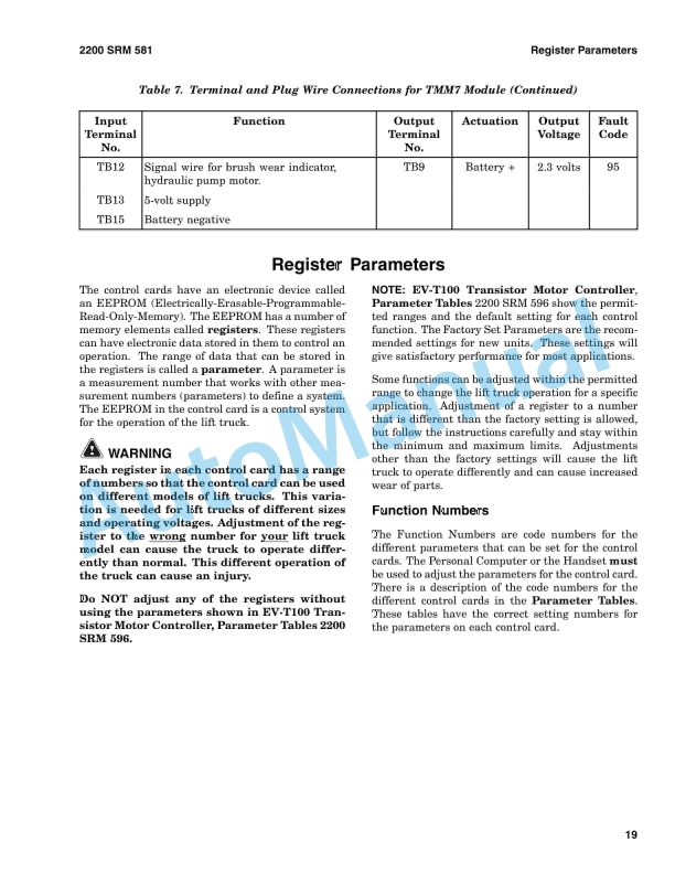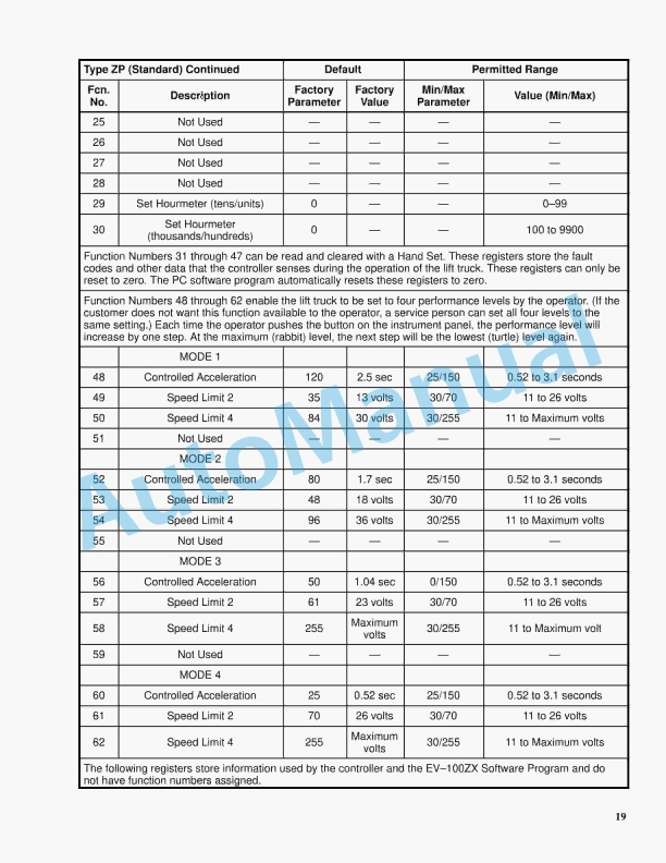 • 99.8. TABLE 7. EV-100ZX Parameters (Low Energy System) (Hydraulic Pump Card Type ZP With or Without Lift Interrupt)