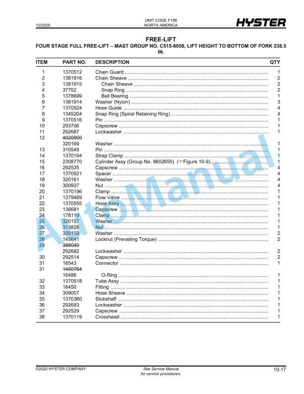 - 17.8. FREE-LIFT FOUR STAGE FULL FREE-LIFT – MAST GROUP NO. C515-6058, LIFT HEIGHT TO BOTTOM OF FORK 238.5 IN.
