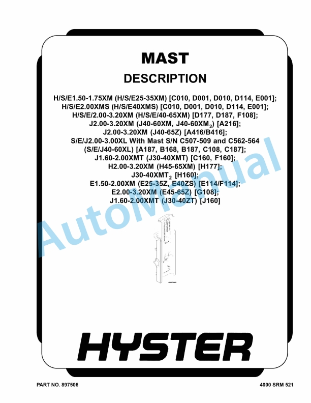 Hyster H-S-E1.50-1.75M to J1.60-2.00XMT Mast Description Maintenance And Repair