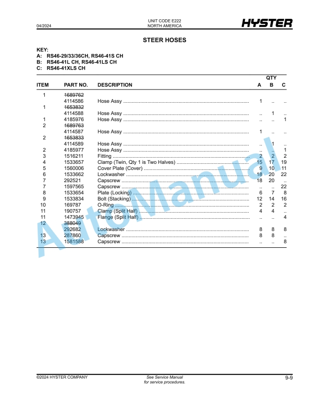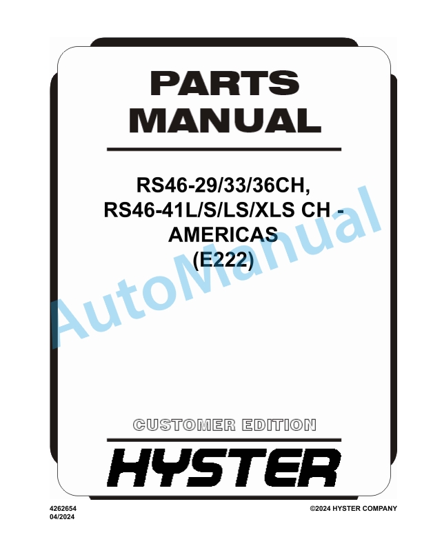 Hyster RS46-29CH, RS46-33CH, RS46-36CH, RS46-41L-CH, RS46-41S-CH, RS46-41LS-CH, RS46-41XLS-CH Americas (E222) Parts Manual