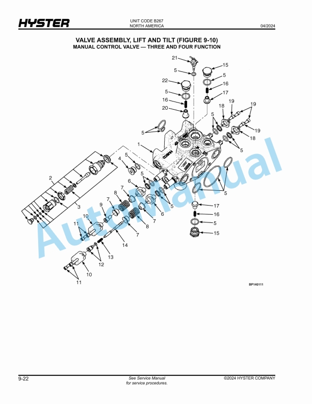 - 22.10. VALVE ASSEMBLY, LIFT AND TILT MANUAL CONTROL VALVE – THREE AND FOUR FUNCTION