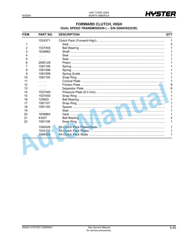 - 34.17. FORWARD CLUTCH, HIGH DUAL SPEED TRANSMISSION ( S/N G004V02223E)