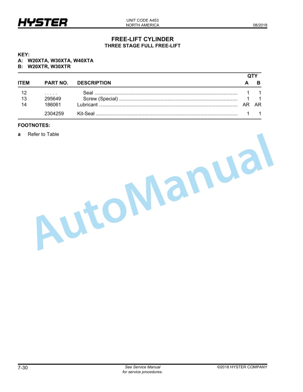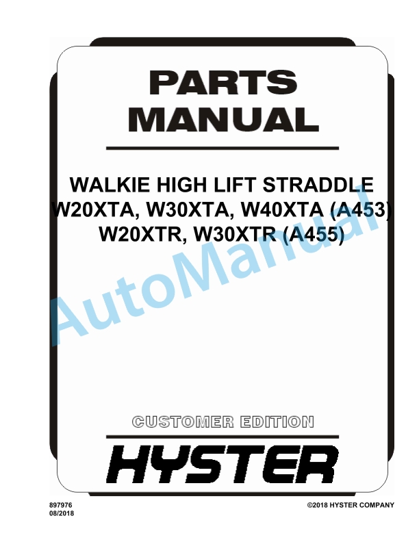 Hyster W20XTA, W30XTA, W40XTA (A453), W20XTR, W30XTR (A455) Walkie High Lift Straddle Parts Manual