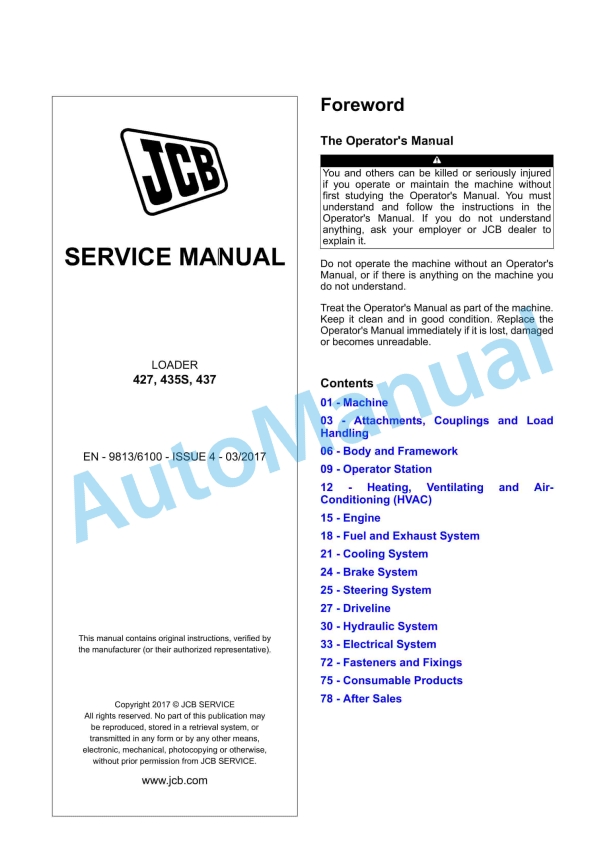 JCB 427, 435S, 437 Loader Service Manual 9813-6100