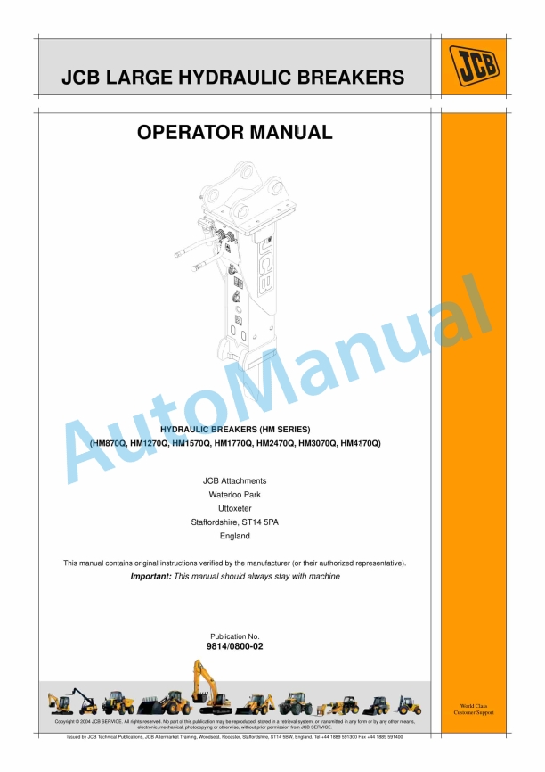 JCB HM870Q, HM1270Q, HM1570Q, HM1770Q, HM2470Q, HM3070Q, HM4170Q Hydraulic Breakers Operator Manual 9814-0800-02