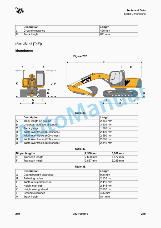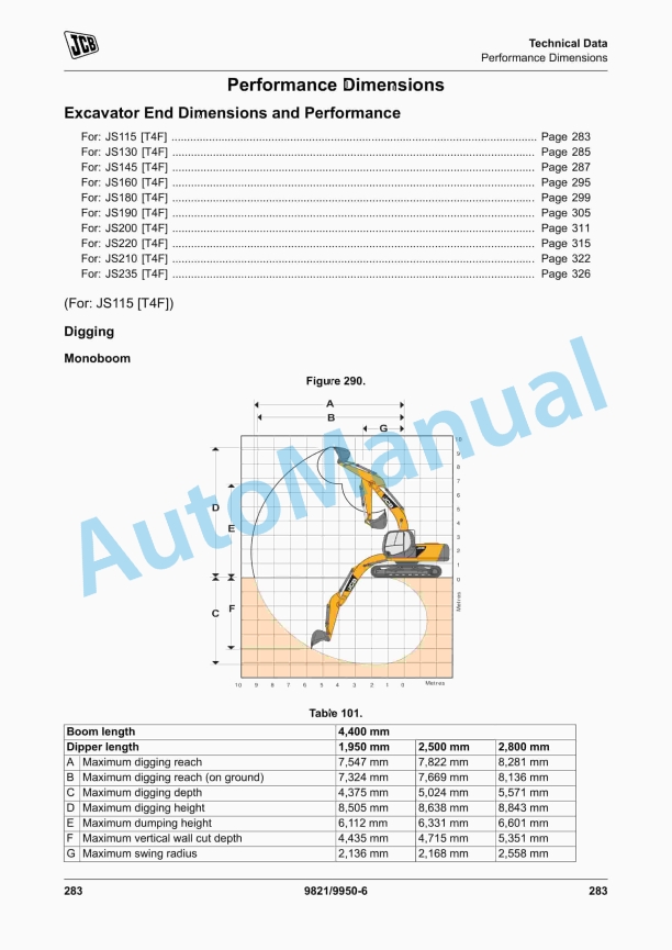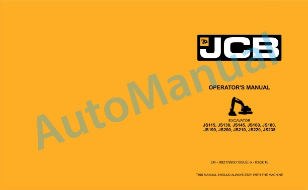 JCB JS115, JS130, JS145, JS160, JS180, JS190, JS200, JS210, JS220, JS235 Operator Manual 9821-9950