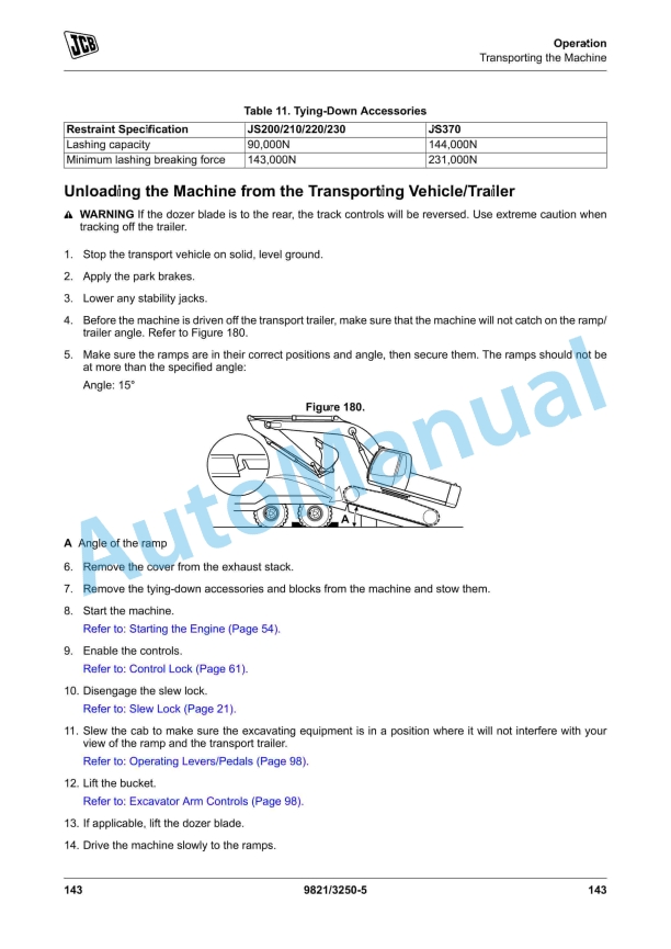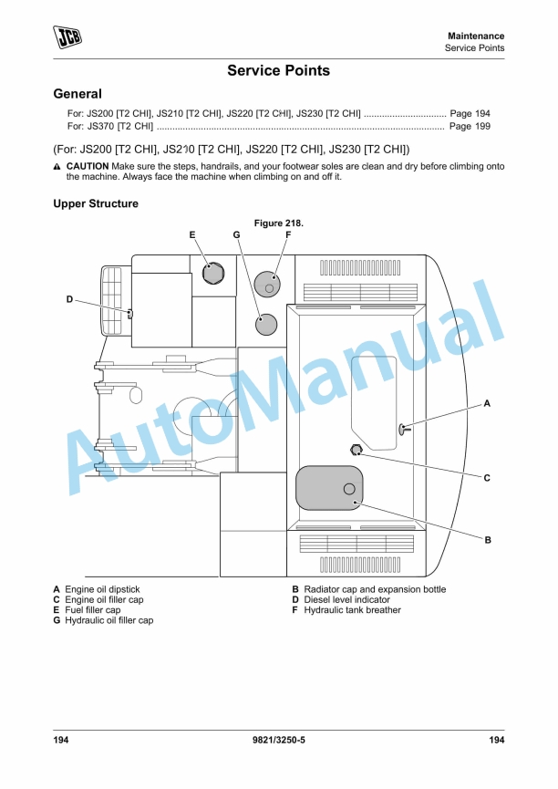 JCB JS200, JS210, JS220, JS230, JS370 Excavator Operator Manual 9821-3250