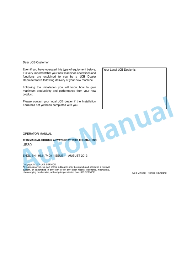 JCB JS30 Operator Manual 9821-7400