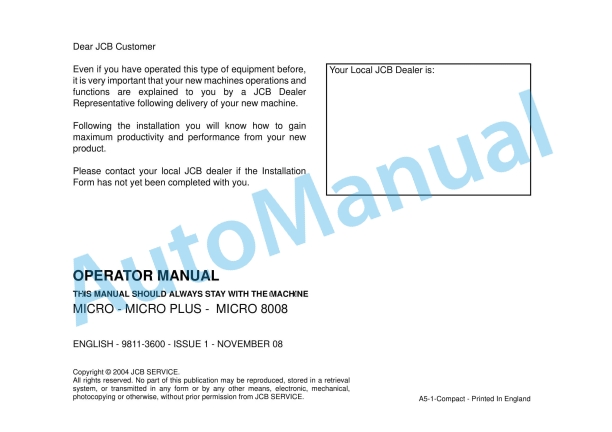 JCB Micro – Micro Plus – Micro 8008 Operator Manual 9811-3600