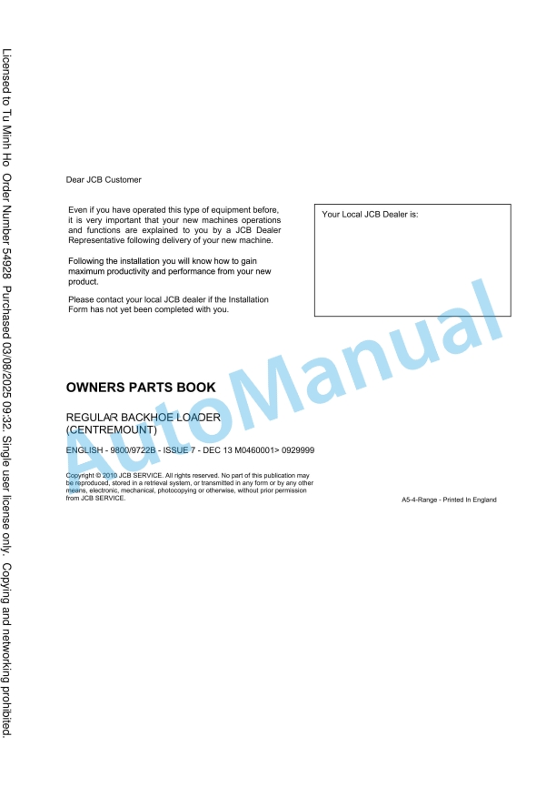 JCB Regular Backhoe Loader Owners Parts Book 9800-9722B-2