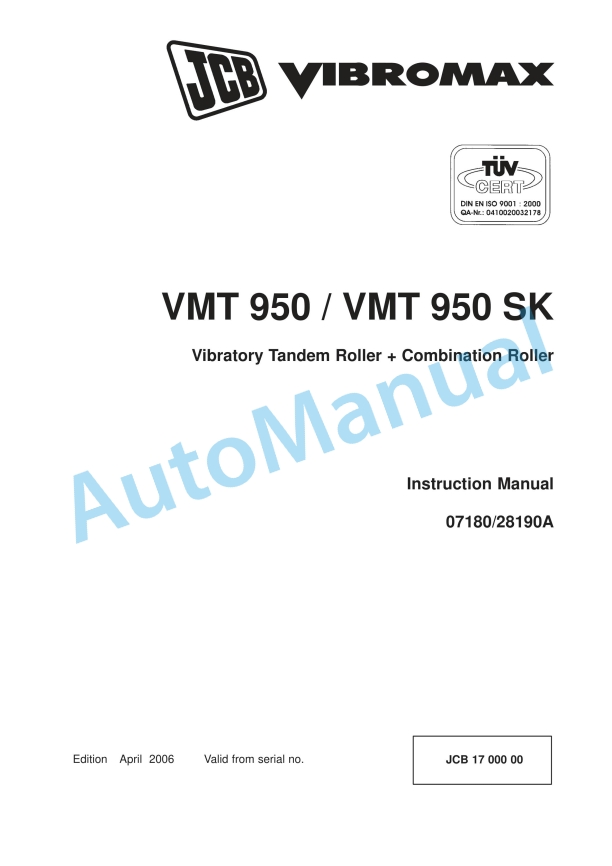 JCB VMT 950 Vibratory Tandem Roller, VMT 950 SK Combination Roller Instruction Manual 07180-28190A
