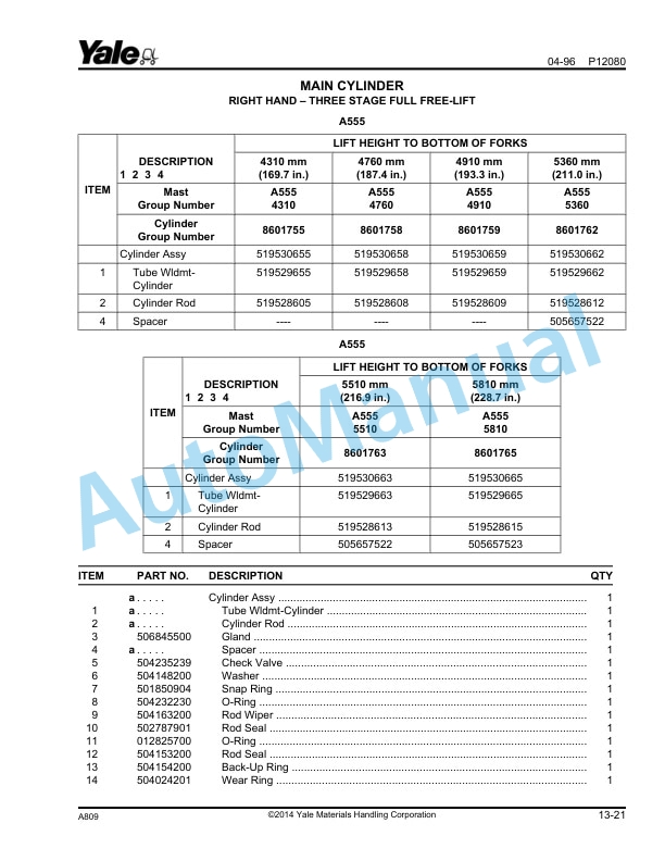 Yale A809 GC-GLC030-040AF Parts Manual 504250775