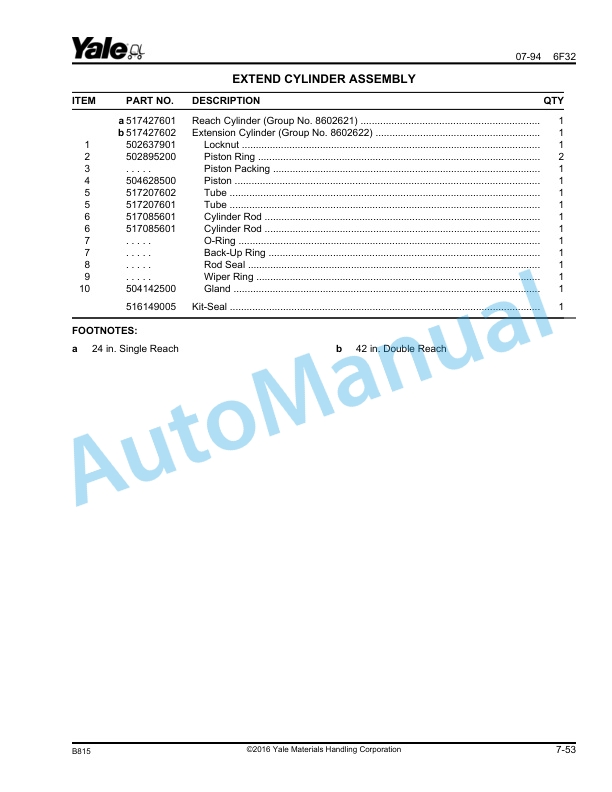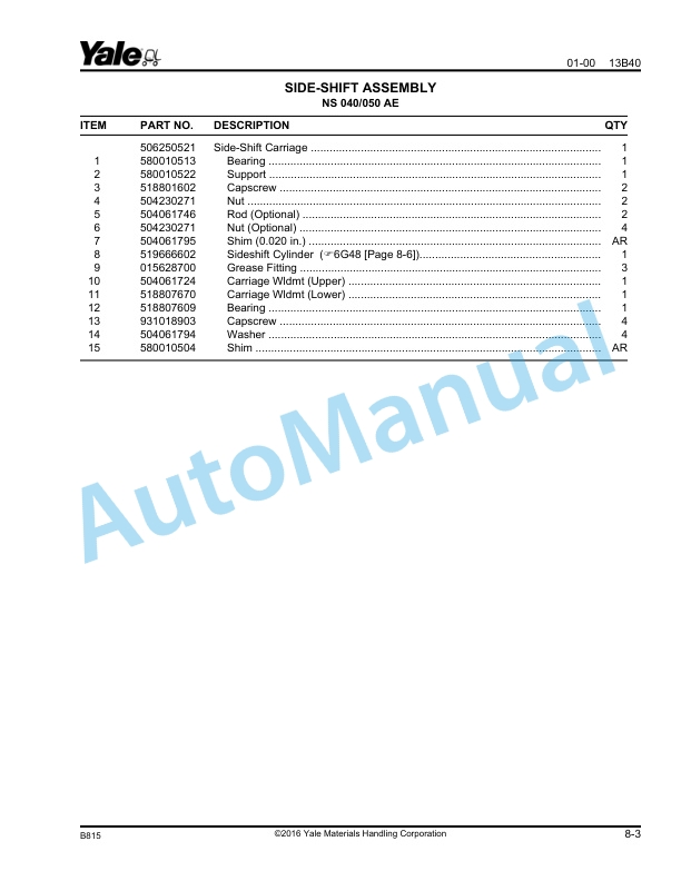 Yale B815 – B816 NDR030AD, NR035AD, NR040AD, NR045AD – NS040AE, NS050AE Parts Manual 520371704