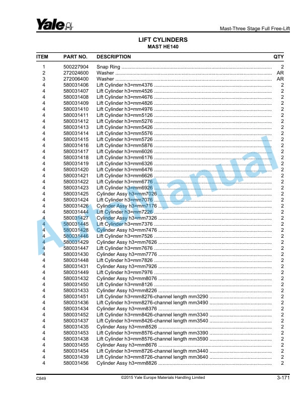 Yale C849 MR14-14H, MR16-16H-16N, MR20-20H-20W, MR25 Parts Manual 524158717