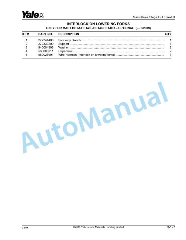 - 59.43. INTERLOCK ON LOWERING FORKS ONLY FOR MAST BETA/HE140L/HE140/HE140R – OPTIONAL ( 5/2009)