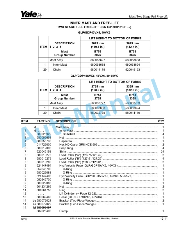 Yale G813 GLP-GDP40VX5, 40VX6, 45VX6, GLP-GDP45SVX5, 50VX, 55VX Parts Manual 524329171