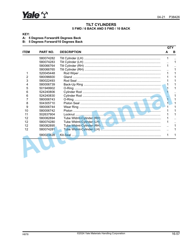 Yale H878 GP135VX, GLP135VX, GDP135VX, GP155VX, GP155SVX, GP170SVX Parts Manual 550256260